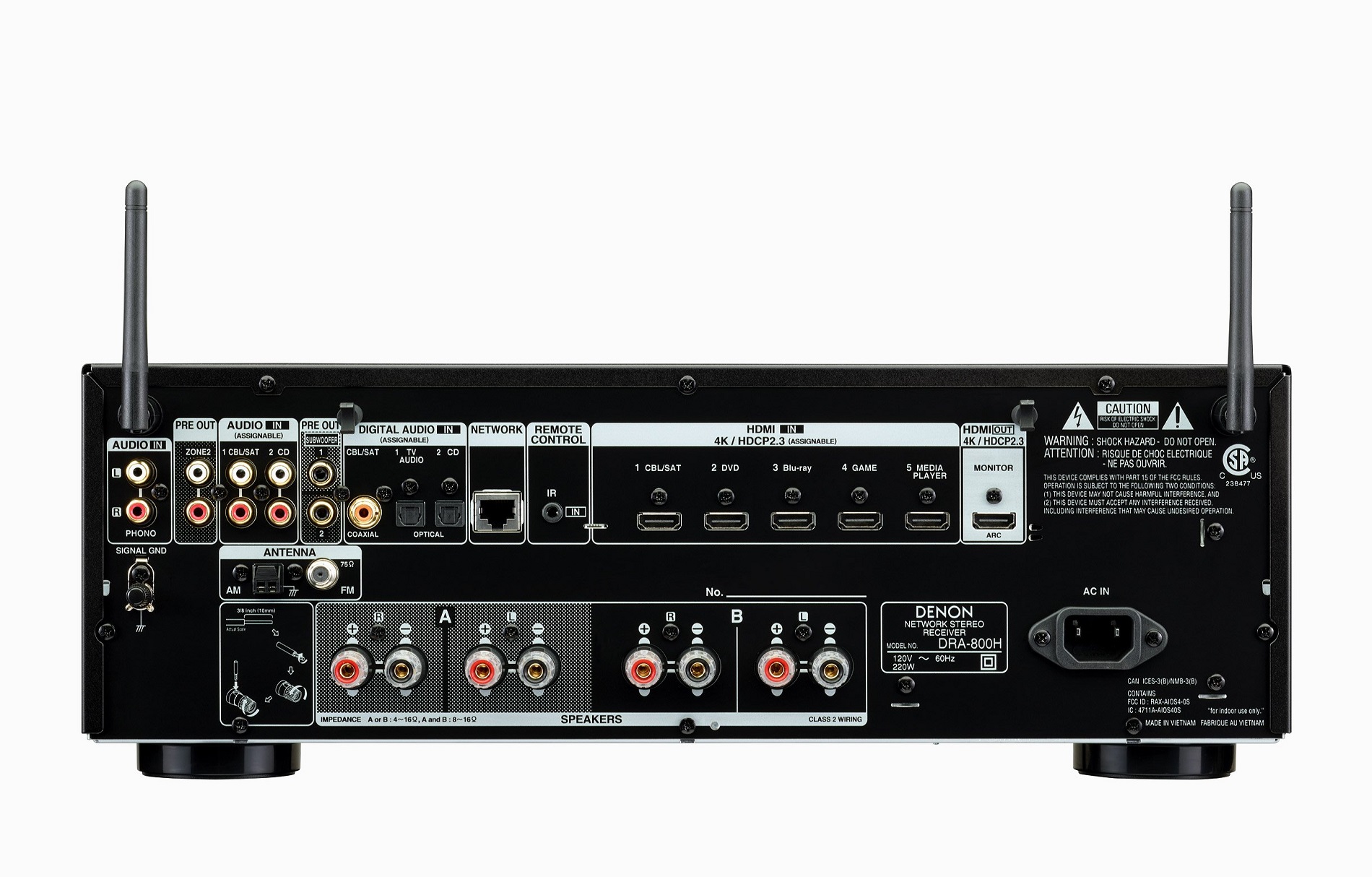 Stereo receivers tend to look very similar from the front, but the components on the inside and the connections on the back can make a huge difference. The Denon DRA-800H is designed for high performance, featuringa discrete high-current power amplifier that uses a symmetrical layout and a beefy transformer with oxygen-free copper windings. It's also highly versatile: it can play music from digital and analog wired sources, stream wirelessly, and —thanks to a bank of HDMI connections on the back panel —even enhance TV sound.