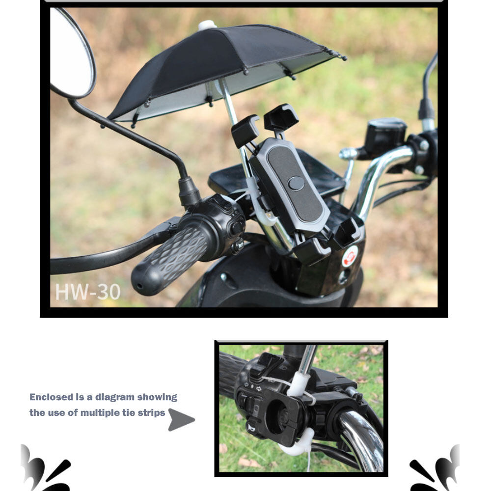 3.This mini umbrella can be a decorative toy for your locomotive (electric car, scooter). It is tied to the base of the bracket with a cable tie, which can protect the phone from wind and rain and sun exposure.