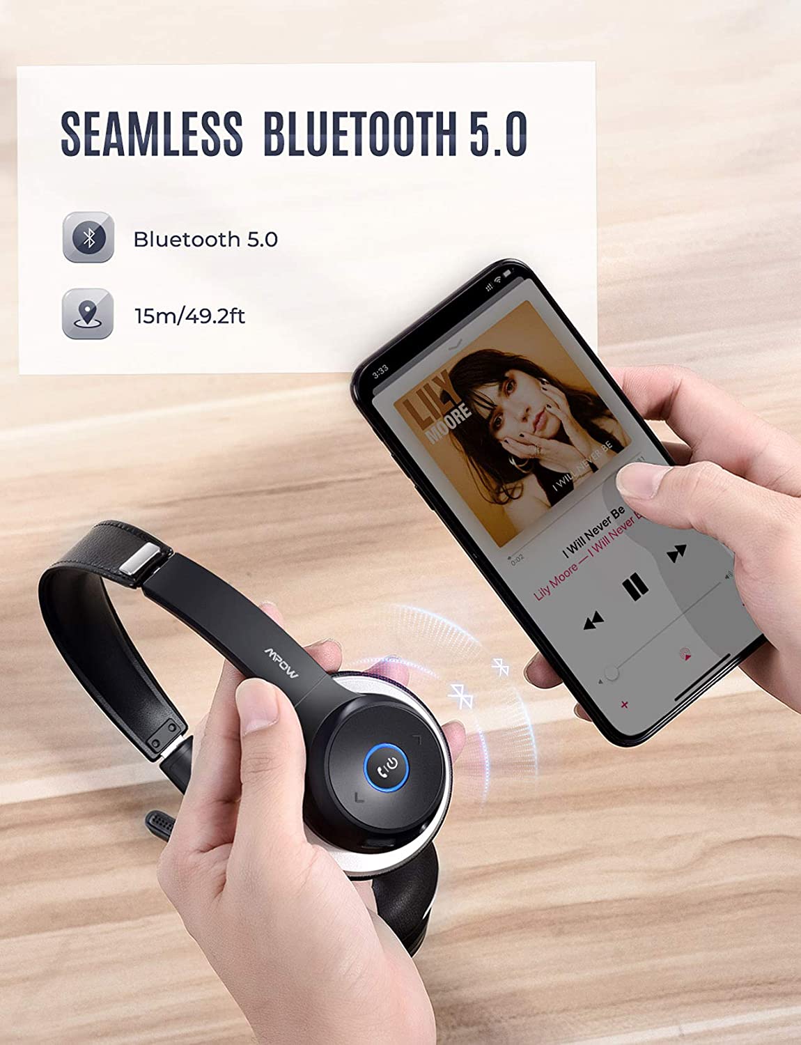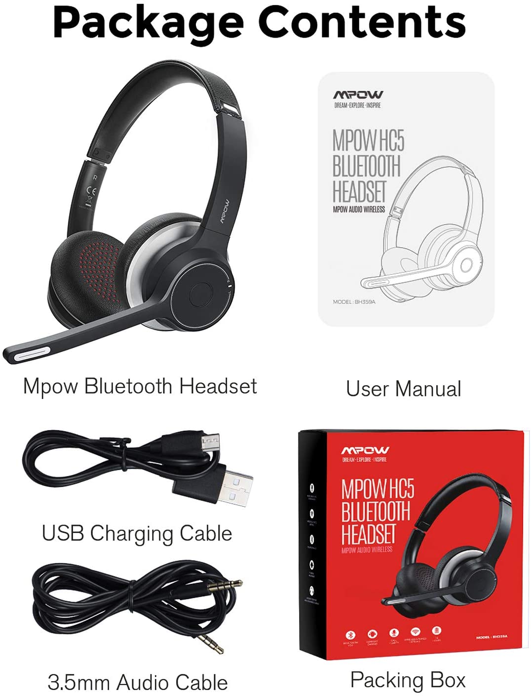 ADVANCED BLUETOOTH TECHNOLOGY: Superior Qualcomm V5. 0 Bluetooth chip for stable connection and up to 50ft/15m distance between your device with Mpow HC5 Bluetooth headset. Dual Bluetooth connectivity to two devices at the same time for calls and music. Seamless switch from working to relaxing.CRYSTAL CLEAR SOUND &DUAL NOISE-CANCELING MIC : HD voice for crystal-clear calls and music for better concentration on conversation. This wireless headset with CVC8. 0 noise canceling mic to monitor and counter ambient noise for meeting open office & outdoor requirements.With Unique dual microphone design, one Mic for captures your vocie,other one for reducing background noise.270° rotatable design to suit for left or right ear. Perfect for Skype chat, conference calls, call center, webinar. Note: The mute button can only used on cellphone, if you need to mute on Skype or other calling software on PC, please set it through software.LONG BATTERY LIFE&ALL DAY COMFORT: Mpow HC5 office wireless headset supports up to 22 hours for talking in a 1. 5-2 hours charging, over 200 hours standby time, always ready to answer or make a hands-free calls. Ultra-soft, leather ear cushions with internal memory foam padding, and on-the-ear design for providing all-day on-the-go comfort. Adjustable leather headband for personalized fit. Moreover, 90 degree rotatable ear cups make the business headset perfect for space-saving storage.WIRELESS/WIRED MODE OPTIONAL: Mpow HC5 wireless Bluetooth headsets work with common calling applications for computers, tablets, and cellphones. 3. 5mm audio cable packed for working with your devices those which has no Bluetooth function or prepare a Bluetooth receiver by yourself.CALL / MUSIC SETTING ON PC AND SOFTWARE LIKE SKYPE, ZOOM, MS TEAM, ETC: Connected headset to your PC, enter Control Panel ---- Sound --- Set Bluetooth Hands-free Audio as default audio device. Set Bluetooth Audio Input Device as default microphone device. Once it set correctly, please confirm that the default device of your calling software also have been set correctly (if there is no sound for first time use, double-click MFB to activate headset). If you want to listen to music on Windows system, please follow steps below: enter the Control Panel ---- Sound ---Set Bluetooth Audio Renderer as the default audio device. Set Bluetooth Audio Input Device as the default microphone device.Package Contens 1×Mpow HC5 Bluetooth headset 1×3.5mm audio cable1×User manual