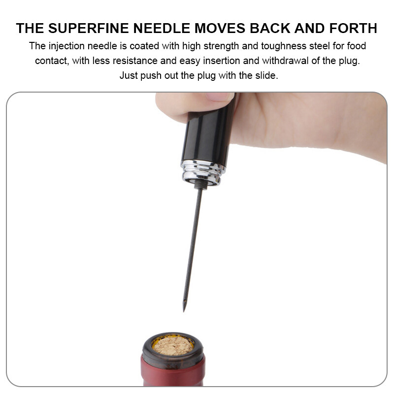 * Easy to use: This air pump wine opener is a simple, easy and fast way to open up a bottle of wine without the hassle of pulling and twisting, simply slid the needle in, pump a few times and the cork is out.