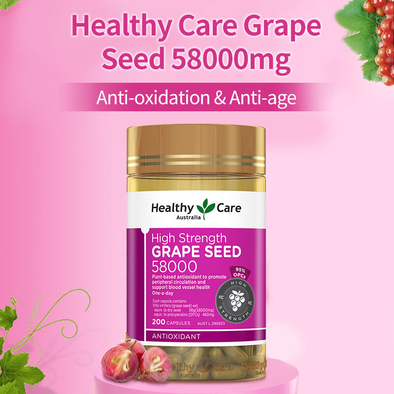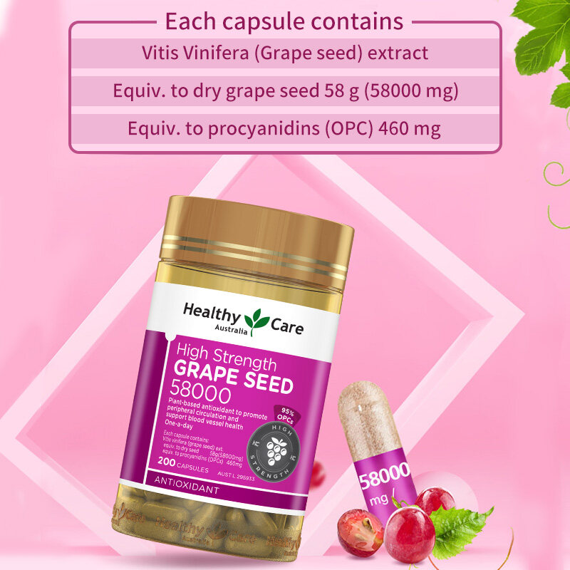 Healthy Care High Strength GrapeSeed 58000 is an advanced formula of a powerful plant-based antioxidant. It contains a rich natural source of flavonoids, including Oligomeric proanthocyanidins (OPCs), which protects the body cells from damage caused by free radicals.Healthy Care High Strength GrapeSeed 58000 is formulated with high quality ingredients to:- Help enhance collagen formation.- Maintain blood circulation to the peripheral areas of the body (legs, hands and feet).- Maintain cardiovascular system health.- Maintain blood capillary and vessel health.Benefits include:- Helps reduce free radical damage to body cells.- Helps to maintain general health and wellbeing.- Helps enhance blood circulation to the peripheral areas of the body (legs, hands and feet).- Helps to maintain cardiovascular system health.- Helps to maintain blood vessel and capillary health.Each capsule contains:Vitis Vinifera (GrapeSeed) extractEquiv. to dry grapeseed 58 g (58000 mg)Equiv. to procyanidins (OPC) 460 mgAdults: Take 1 capsule daily or as directed by your healthcare professional.Children under 12 years: Only as professionally prescribed.