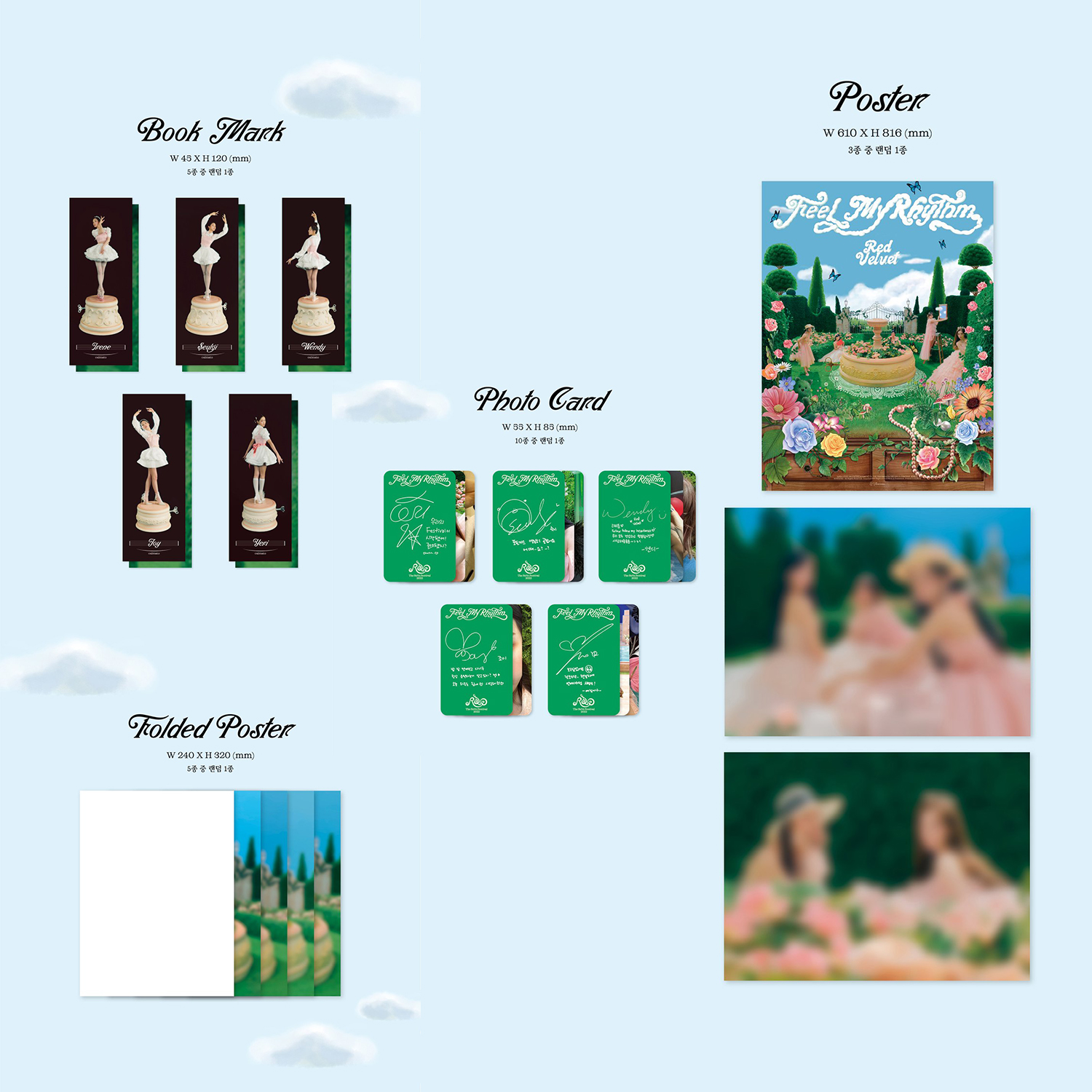 ❥ Red Velvet - Mini Album [The ReVe Festival 2022 - Feel My Rhythm] ✿ FEATURES ✿  □ Release Date   ■ 2022.03.22  □ Version   ■ ReVe Ver. (2 Type)  □ Components   [ReVe Ver.](capriccioso / calmato)   ■ Dust Jacket (2 Type)   ■ Cover (2 Type)   ■ CD-R (2 Type)   ■ 108p Photobook   ■ Sticker (Random 1 out of 2)   ■ Book Mark (Random 1 out of 5)   ■ Folded Poster (Random 1 out of 5)   ■ Photocard (Random 1 out of 10)   ■ Poster (Random 1 out of 3) * Poster is Optional ⯌ FREE GIFT ❥・•Only TrendK Store Gift~❥  ? 2 Red Velvet Print Badges  ? 4 Extra Photocards ✶ Free gift's image may change without notice. ✶ Even if you purchase multiple albums, only one of the same Free Gift is provided.