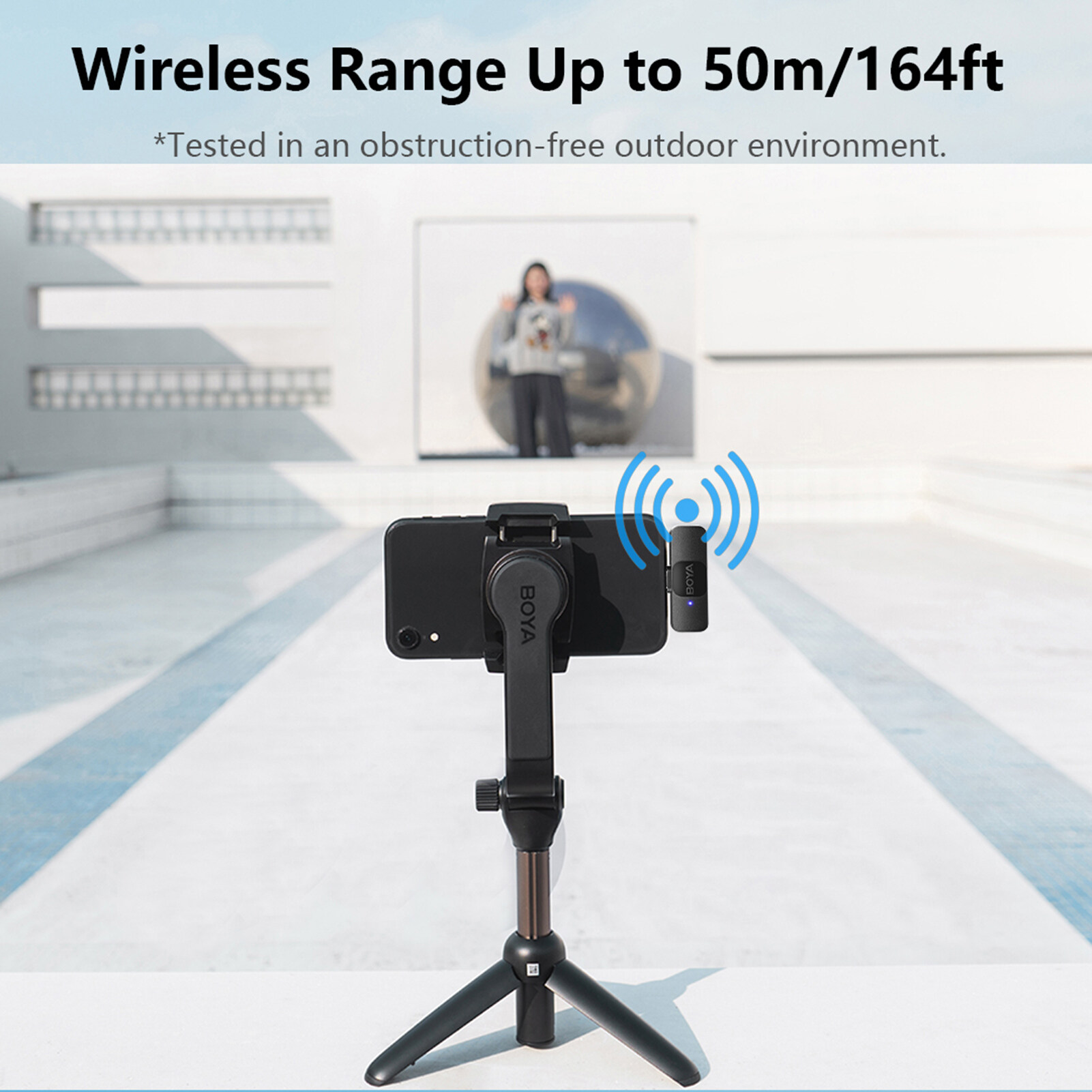 【Long Distance and Clear Transmission】Up to 50M effective transmission helps you to realize long-distance recording easily. Built-in smart noise reduction module, the wireless microphone can effectively filter out the noise to improve sound quality by turning on the NR function.