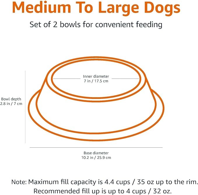 Amazon Basics Stainless Steel Non-Skid Pet Dog Water And Food Bowl, 2-Pack (10 x 2.8 Inches), Each Holds Up to 4 Cups