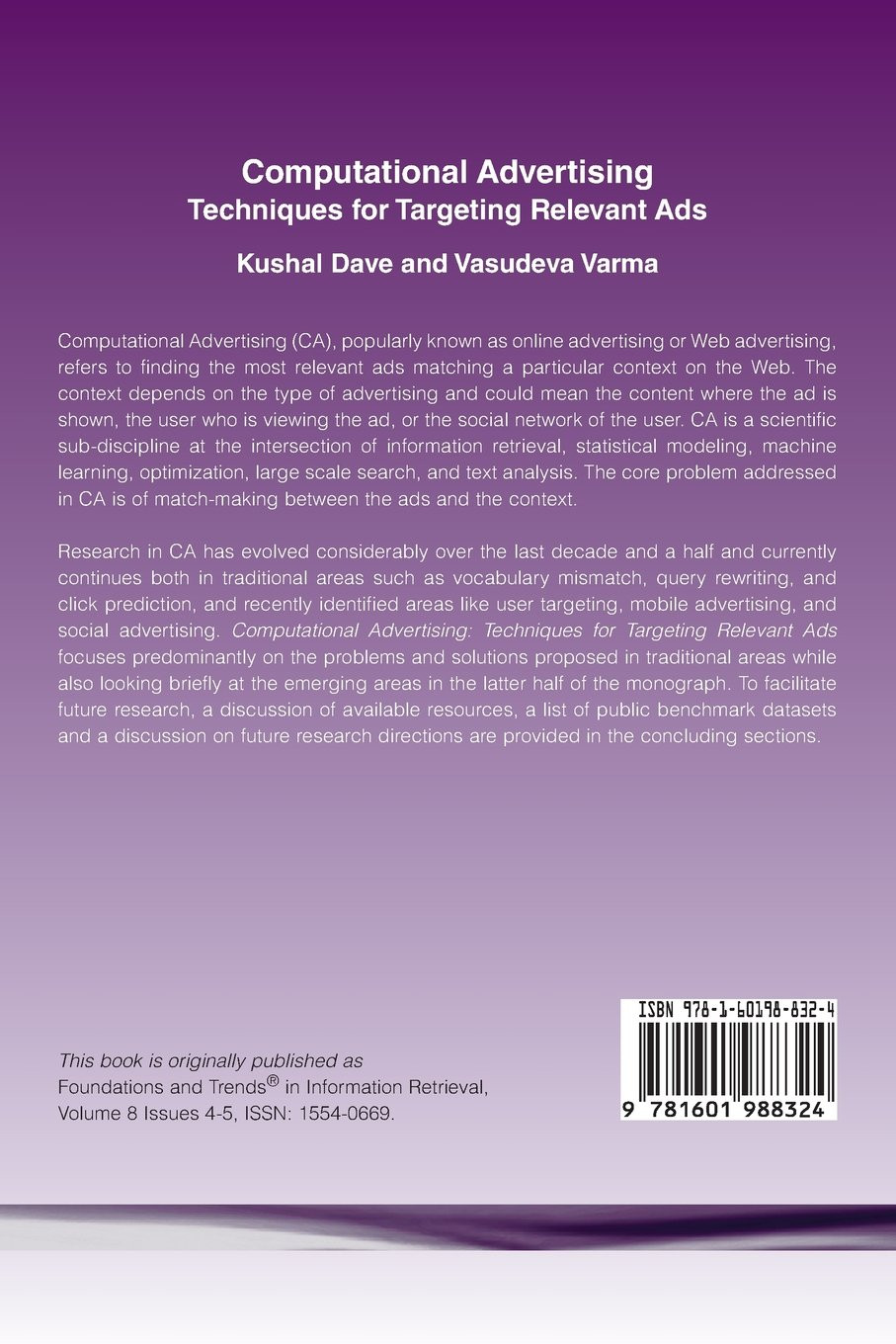 Computational Advertising (CA), popularly known as online advertising or Web advertising, refers to finding the most relevant ads matching a particular context on the Web. The context depends on the type of advertising and could mean the content where the ad is shown, the user who is viewing the ad, or the social network of the user. CA is a scientific sub-discipline at the intersection of information retrieval, statistical modeling, machine learning, optimization, large scale search, and text analysis. The core problem addressed in CA is of match-making between the ads and the context. Research in CA has evolved considerably over the last decade and a half and currently continues both in traditional areas such as vocabulary mismatch, query rewriting, and click prediction, and recently identified areas like user targeting, mobile advertising, and social advertising. Computational Advertising: Techniques for Targeting Relevant Ads focuses predominantly on the problems and solutions proposed in traditional areas while also looking briefly at the emerging areas in the latter half of the monograph. To facilitate future research, a discussion of available resources, a list of public benchmark datasets and a discussion on future research directions are provided in the concluding sections.