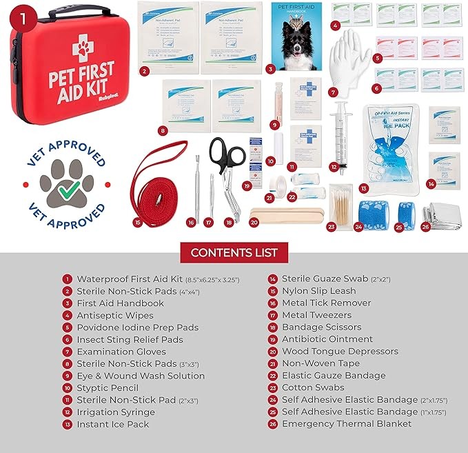 Dog First Aid Kit | Vet Approved Pet First Aid Supplies to Treat Dogs & Cats in an Emergency | Pet First Aid Kit Book, Tick Remover, Slip Leash & Medical Essentials for Home, Camping, Car, RV, Travel