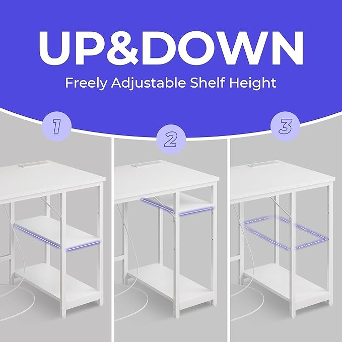 JOISCOPE 48 Inches Computer Office Desk with Table Power Outlets, Home Office White Desk with Storage Shelves and USB & Type-C Outlet for Bedroom, Home Office, Morden Simple Writing Table, White